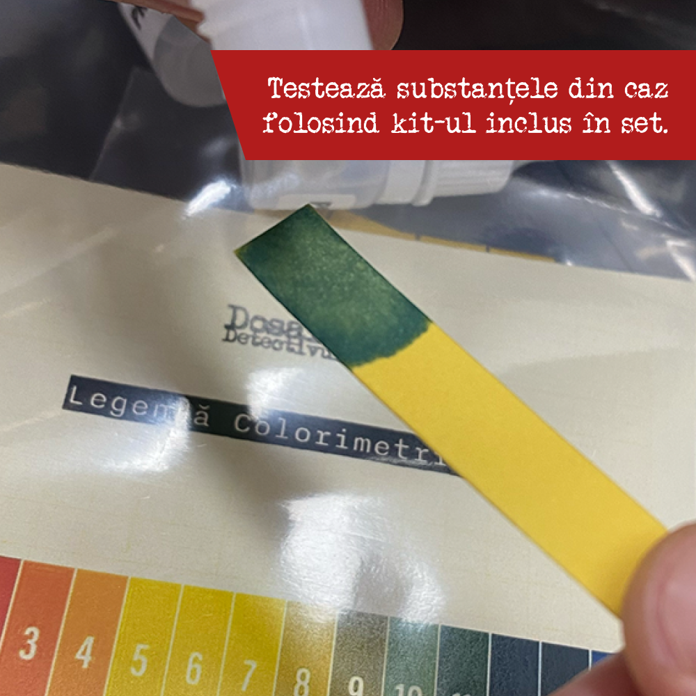 Kit-ul de testare conține trei tuburi cu picurător și fâșii de hârtie reactivă. Fiecare probă chimică poate ascunde o dovadă crucială – culoarea rezultată îți va spune totul, dar doar dacă știi să interpretezi indiciile.