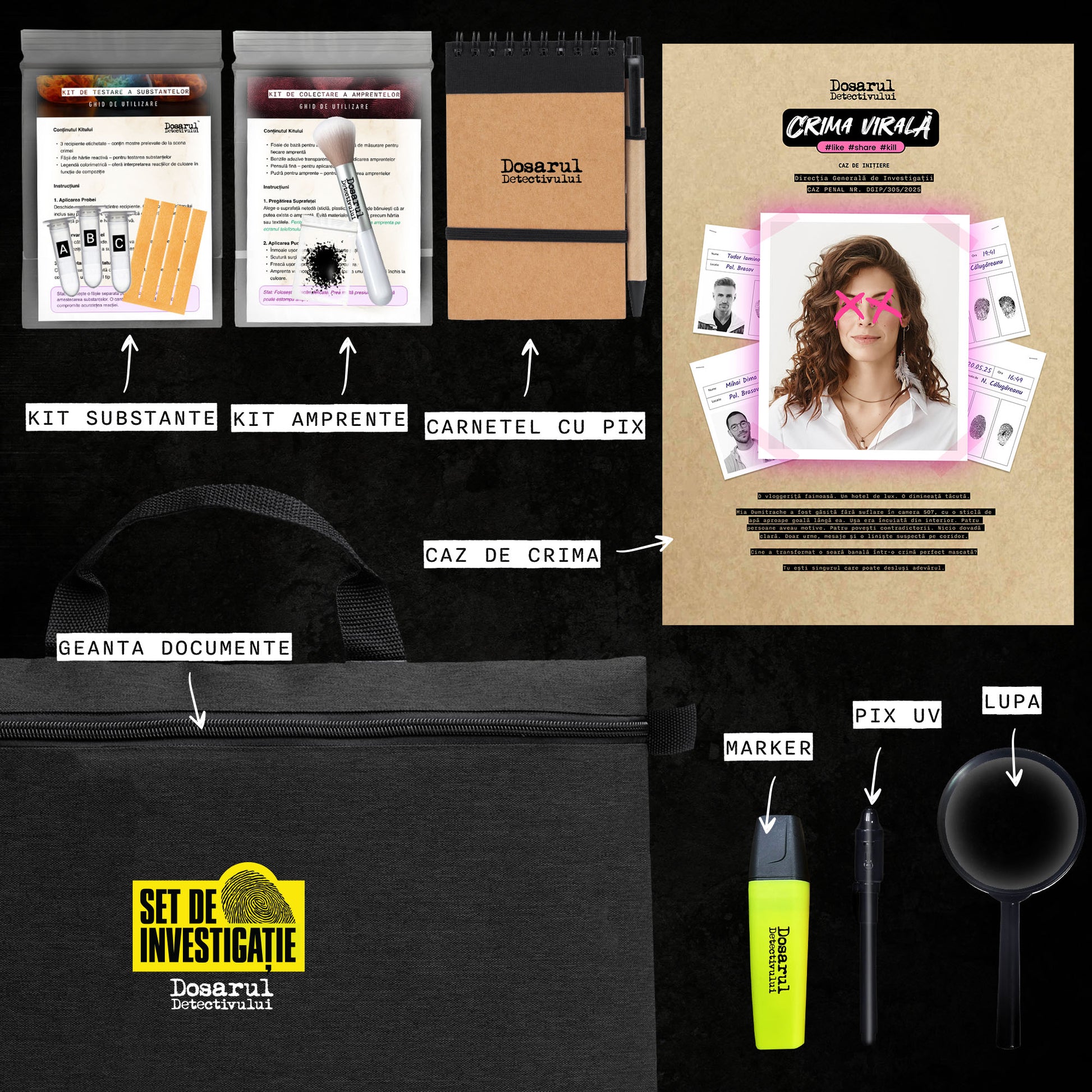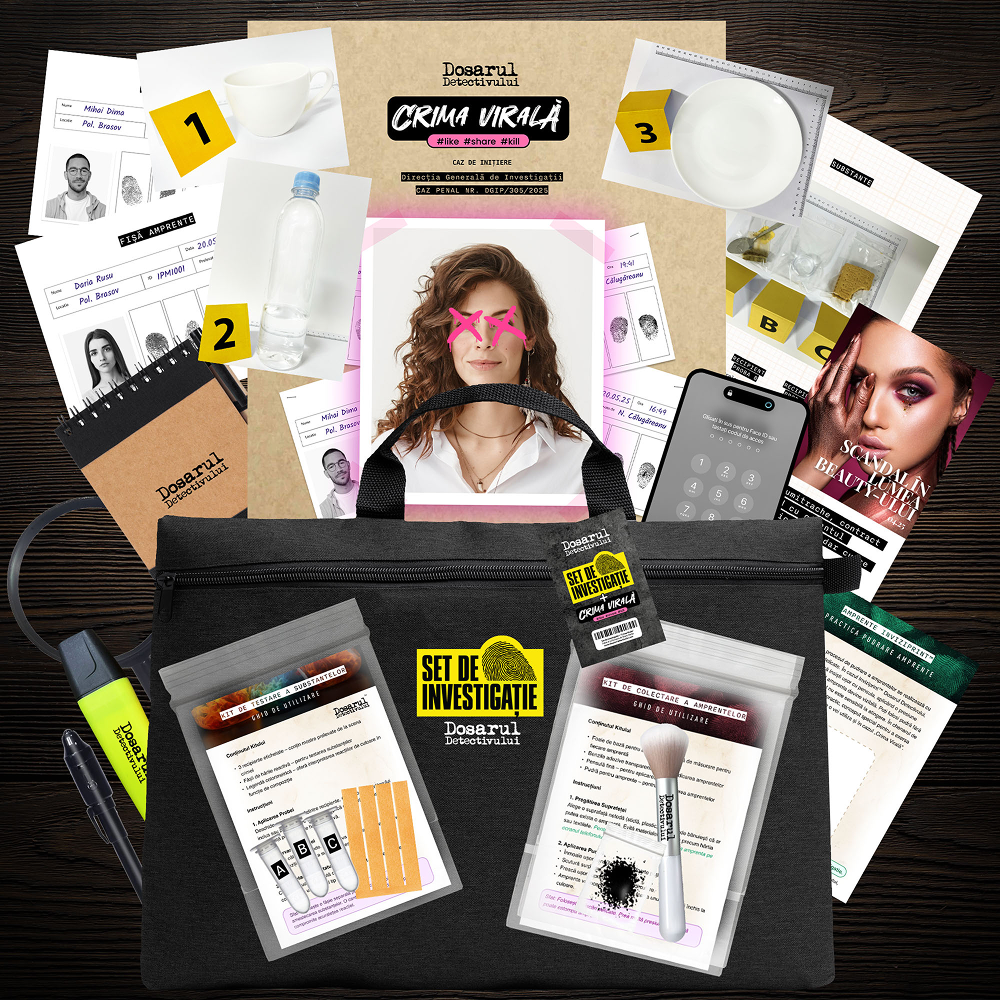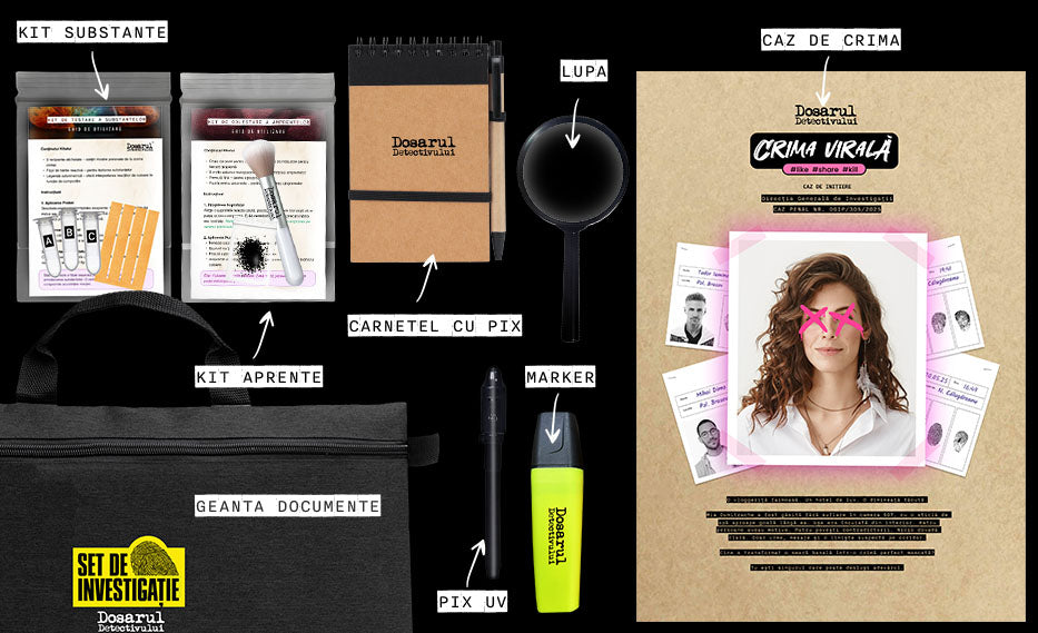 Crima Virală vine la pachet cu un kit complet de investigație, creat special pentru detectivii moderni. În interiorul portdocumentului elegant, prevăzut cu fermoar și mâner, vei găsi: o agendă de anchetă cu pix pentru notițe, un marker highlighter pentru evidențierea indiciilor, un pix cu cerneală invizibilă și lumină UV, o lupă pentru analiză detaliată, trusa de prelevare a amprentelor și kitul de testare a substanțelor. Totul este gândit pentru o experiență completă, care îmbină jocul cu adevărata muncă de investigație.