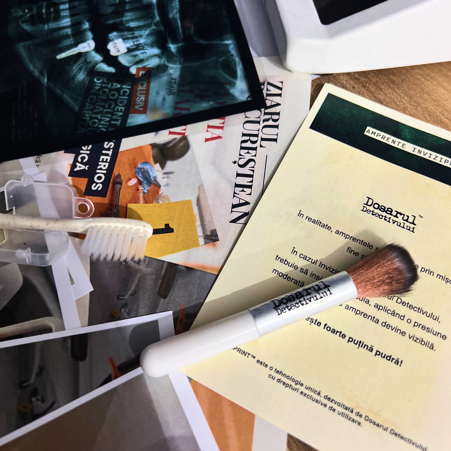 Dosarul Detectivului este singurul joc de investigație în care poți descoperi amprente reale exact ca într-o anchetă criminalistică: cu pensulă și pudră specială, aplicate direct pe probele din dosar. Tehnica INVIZIPRINT™, dezvoltată intern și protejată prin patent, transformă fiecare caz într-o experiență autentică, în care logica și simțul observației devin principalele tale arme.